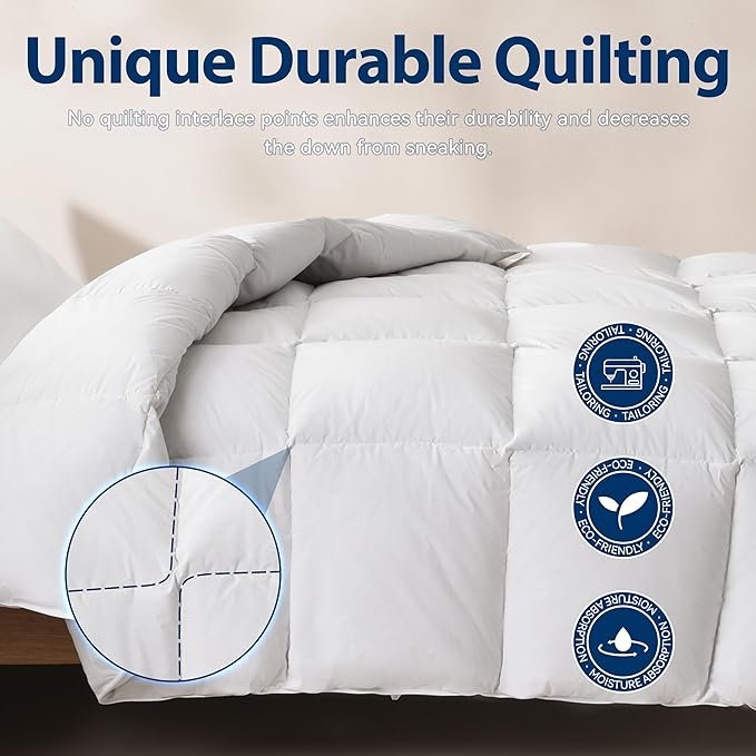 End-to-end box quilting keeps the fill evenly distributed and won’t shift. Our quilt has no quilting interlaced points to enhance its durability and prevent down from sneaking out. No need to worry about the fill shifting and leaking.